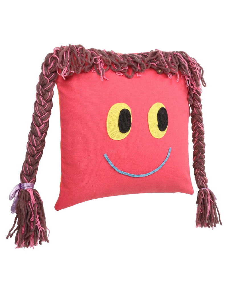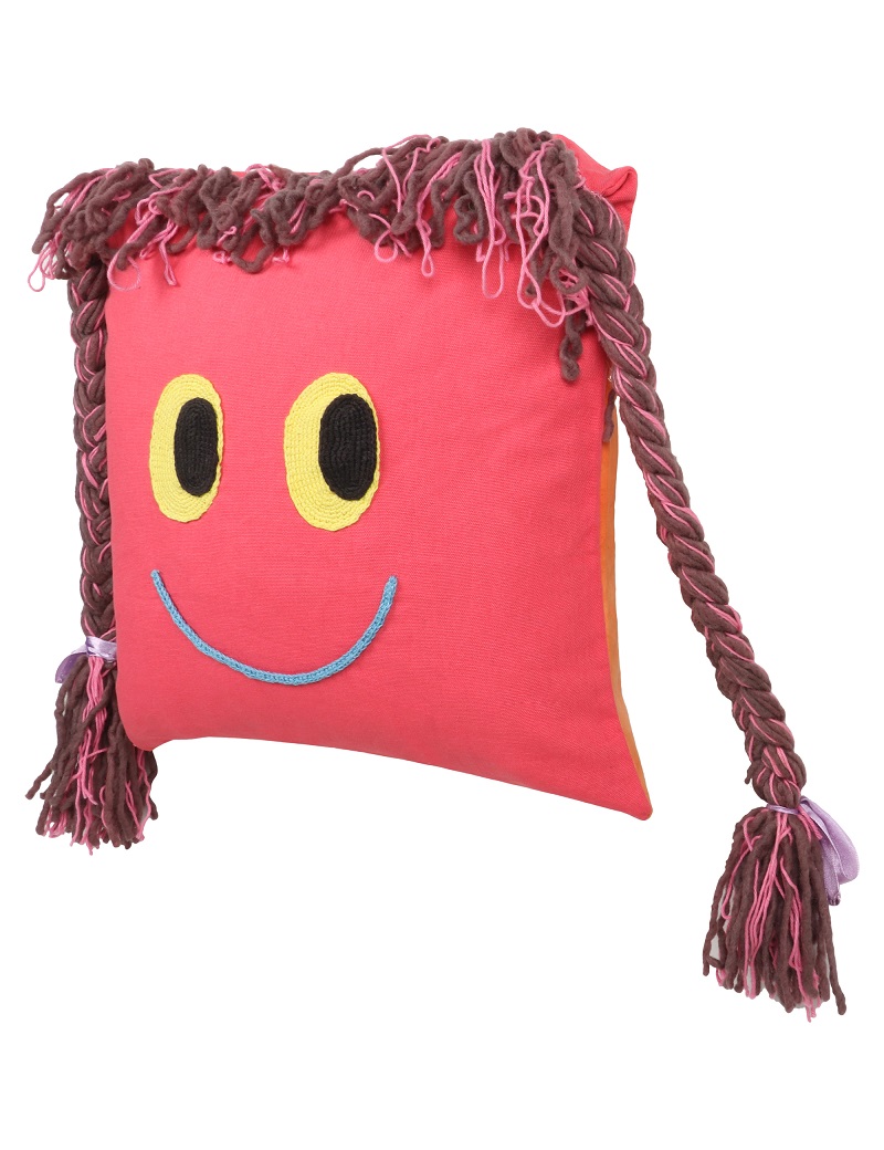 A Doll Cushion for your little Princess which serves as a cushion for the bed and the sofa and provide a more fun game experience .  It is  hand crafted by  our skilled craftsmen especially by  women who  have made eyes and braids by crochet and  braiding techniques.